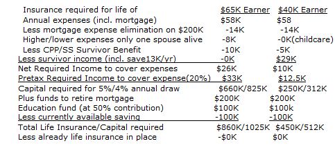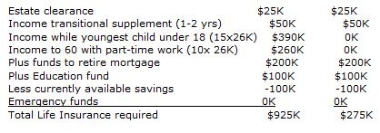 In this case, whatever the approach used, the insurance required for the primary breadwinner, assuming that, after death, the surviving spouse stays home while children are less than 18, is about 15x gross income. The Table in Case 3 above summarizes the results of the various alternatives to calculating life insurance needs.