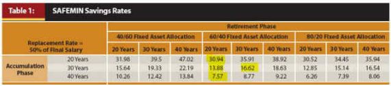 You can readily observe what savings rate was required historically over 20/30/40 years to deliver inflation adjusted 50% of final year salary for the following 20/30/40 years, and the effect of asset allocation on these savings rates. Some of the SAFEMIN savings rates are staggering even at the 50% replacementlevel, and they demonstrate the importance of starting to save early. (The other message not mentioned in the paper, but stares you in the face, is the value of having access to a low-cost (pure) longevity insurance product, which not only insures a lifetime income stream, but also allows one to focus on a 20 year retirement phase (the approximate joint life expectancy of a 65 year old couple. The approximate cost of such insurance is less than the saving achieved by reduction of retirement phase from 30 to 20 years.) Increasing the replacement rate from 50% to some other number just requires increasing the SAFEMIN proportionately.