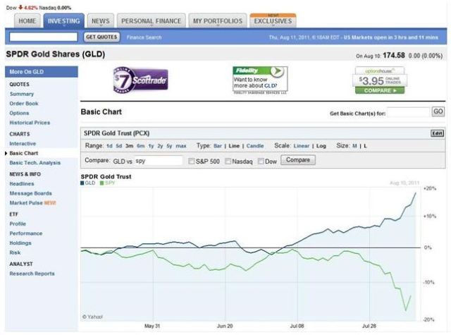 For the last three months at least, gold appears to have delivered on its promise of providing some insurance against instability by being negatively correlated with stocks. Look at the following three month chart showing reasonable representations of the performance of gold (GLD) and the S&P500 (SPY) from Yahoo-Finance. Of course, a 5% allocation to gold accompanied by 50% allocation to stocks did not save your portfolio from a significant drop, it just eased the pain a little. (This is not a recommendation to buy gold!)