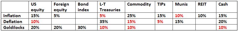 Jeff Opdyke’s WSJ article “How to build a portfolio wisely and safely”discusses considerations that go into the building of your portfolio in case you have a “view” about: inflationary, deflationary or goldilocks economic future. The portfolio for each scenario is then “insured” with counterweighing assets in 15-30% of the portfolio. For the goldilocks scenario it is 20% US equities, 20% foreign equities 30% US bond index, insured with 10% commodities, 10% long-term Treasuries and 10% cash. Opdyke’s suggested portfolios for all three scenarios are shown below with the insurance elements shown in red.