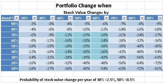 The following simple table gives you the portfolio change (decrease) in value given a particular asset allocation and a percent drop in stock market value (say per year). So (for your willingness to take risk) if the maximum portfolio loss that you are willing to tolerate is 20% and you figure that the maximum loss in the stock market might be 40%-50% then you portfolio should be 50-60% in bonds (see table below). Assuming a Gaussian distribution (the world doesn’t always behave that way as we recently found out) for annual stock market returns with an expected return of 10% and standard deviation of 20%, then there is about a 2.5 % probability of having a loss > 30% and <.5% probability of losses >50% in a year (expected return less2x or 3x the standard deviation; i.e. 10-2×20=-30% and 10-3×20=-50%). By this statistical assumption, last year was an exceptional year (or more likely perhaps the assumed distribution does not fully describe the likely outcomes). So, one would have to look at some worst case scenarios in addition to relying on the Gaussian distribution. And this table gives you a simple way of assess your willingness to take risk making some worst case assumption on annual or tri-annual stock market loss and looking at your assumed portfolio bond content.