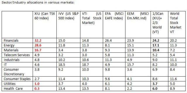 One might want look at a sectoral view of allocation to determine if one’s portfolio has an over-concentration in a particular sector. It is actually interesting to look at different market indexes and note that the Canadian market is relatively undiversified with its very heavy allocation to financials (32%) and commodities (45% including energy and materials) and almost no exposure to other sectors like healthcare and utilities; so for those Canadians invested exclusively in an ETF (index) representing the Canadian market, they end up with a not a very well diversified investment. The US, EAFE and even emerging markets are less sensitive to financials and commodities and give you 8-13% exposure to healthcare. A 1/3 Canadian and 2/3 World stock market (second to last column in table below) provides a better sectoral diversification by reducing concentration to financials and commodities to a more reasonable 24% and 27%, and increases healthcare to 6%; It also adds currency and geographical diversification. Note that for a 50% bond portfolio where the fixed income portion is all in Canadian currency, when 1/3 of the equity exposure is Canadian, the overall Canadian currency exposure is (a not unreasonable) 67%.