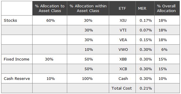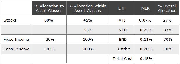 So putting it all together the Canadian investor’s simple and cheap portfolio whose risk tolerance can accommodate a 60% stock and 40% fixed income (bonds and cash), could look like: