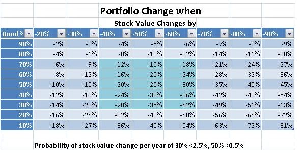 Risk Tolerance First let’s look at the change in a portfolio’s value as a function of percent loss on the stock portion of the portfolio, for various levels of fixed-income (bonds and cash) component in the portfolio (which are assumed to stay unchanged when the stocks lose value).
