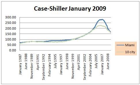 US property values continue to on their downward path. The January report shows Miami values fell 3.6%, 29.5% and 43.4% since previous month, over past 12 months and since the December 2006 peak, respectively. The US 10 city index fell 3.5%, 19.4% and 30.1% since previous month, over past 12 months and since the June 2006 peak, respectively. (You must remember that real estate prices tend to be very local; some parts of the US which didn’t have the major run-up in the early part of the decade, may be behaving in a much more rational manner.)For Miami the prices are back to October 2003 levels, while for the 10 city index at February 2005 levels. The graph does not suggest that we have bottomed. In fact Brett Arends in the WSJ’s “Home prices: Low, but still no bargain” suggests that we are unlikely to have bottomed given overall deflationary pressures and prices-to-average earnings higher than at the peak of 1989 real estate bubble. He also reminds readers that “when the last property bubble burst, it took about eight years before the market showed really strong signs of revival. This bubble was far, far bigger.”