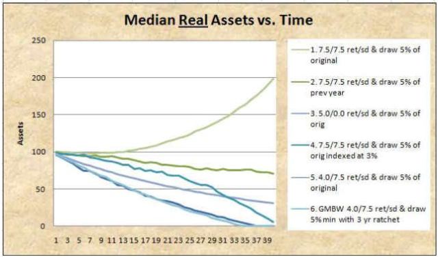 The results will clearly be dependent on the assumption of return, inflation, GMWB specifics and fees.