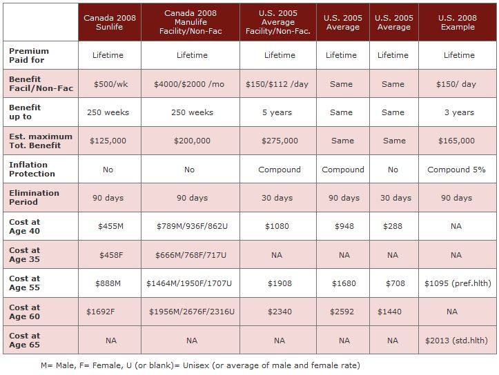 So you must read the policy very carefully! I tried to summarize the Canadian and U.S. data in a single table below, but since the data is from different sources and not necessarily identical parameters (though I tried to keep them close), they are not a perfect apples-to-apples comparison, it is just a simplest mechanism to present some of the available options in Canada and the U.S. (e.g. Sunlife has three types of plans reinbursing: eligible expenses on a given day up to a maximum, fixed daily amount if you have eligible expenses that day, income when care is required without proof that expenses were incurred-reimbursement, indemnity and disability- and I couldn’t determine which was the priced policy.)