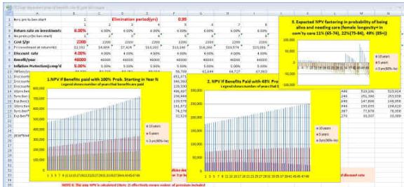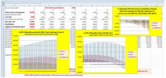 If cost of LTCI is defined by the forgone investment value if premiums were instead invested at 6% (or 8% or 10%) return, then NPV is the discounted “Net Benefit”= LTCI Benefit-LTCI Cost, where LTCI benefit is the discounted value of the 3, 5 and 10 year benefits considered.