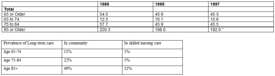 In 1997, the total rate of nursing home residence for persons age 65 and older was 45.3 per 1,000 (Federal Interagency Forum on Aging-Related Statistics, 2000, p. 92). The following table breaks down rate of nursing home residence among persons by age group. It is important to note that rates of nursing home use increase significantly with age:”