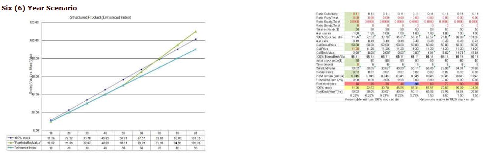 So as you can see that you could build your enhanced indexed structured product with similar characteristics without locking in your assets for 6 years, assuming that you could buy the six (6) year calls for about $11.20 and a strike price of $50, when the initial value of the index is $50! If you believe that there is a significant upside potential in the price index, you may wish to add a small amount (5-10%) of leverage to enhance the index even more by buying more calls.