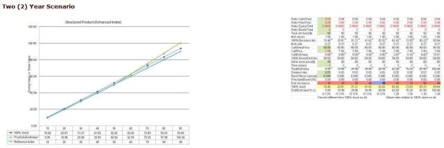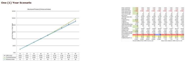 In Structured Product II- Good or Bad? It Depends on Your “View” we discussed how to compare products with different performance characteristics, by using your “view” of the probability of future returns and we compared the expected outcome (value) of an enhanced index structured product with the expected outcomes of the reference index and that of a 50:50 mix of the reference index and a bond maturing at the maturity date of the structured product.