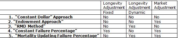 - Changing Percentage: probability of failure mortality updating (“Mortality Updating Failure Percentage”) in which withdrawal amountbased on “maintaining a constant probability of failure over the estimated remaining retirement duration…updated based on survivorship experience”