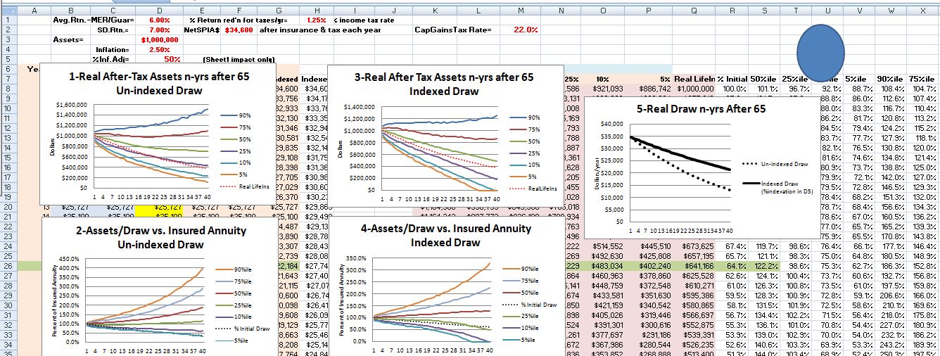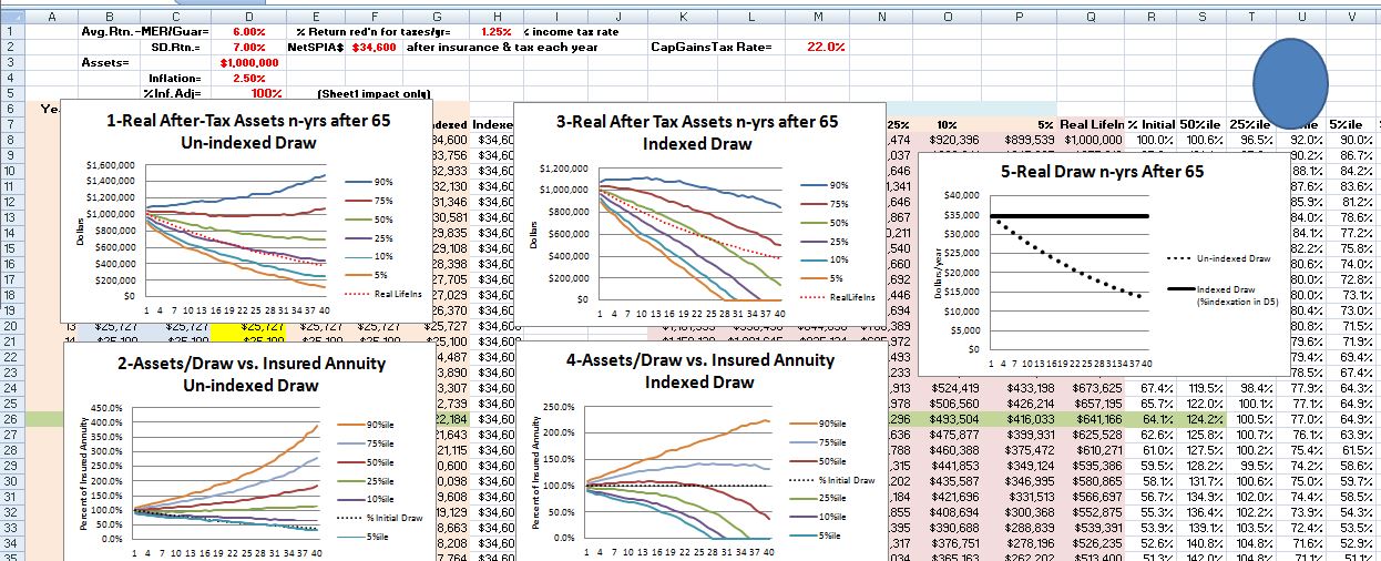 So let’s look at a balanced portfolio of 50% stock and 50% fixed income. A nominal 6% portfolio return with a 7% standard deviation and a 2.5% annual inflation would likely be considered reasonably conservative by historical measures. For simplification of tax treatment let’s assume that annual interest on the 50% fixed income is earned at the 3.5% quoted in the article, while dividends of 2% are earned on the stocks in the other 50% of the portfolio. That means that the portfolio will throw off an average of 2.75% in interest and dividends which very conservatively (as the Canadian portion of the dividends would be taxed lower) will be taxed at 45% introducing a 1.25% (2.75% at 45% is 1.2375%) drag on the 6% return; i.e. we assume that the return is nominal 4.75%. Capital gains taxes will be paid at 22% rate on the portfolio value in excess of $1,000,000 when the portfolio is cashed at death (a reasonably conservative assumption since a part of the assets over $1,000,000 represent after tax dividend and interest dollars). Unlike the case of the annuity, if needed the portfolio assets are available for emergencies at any time. The comparisons are done in after tax real dollars and ratios of assets and draws in systematic withdrawals from the balanced portfolio relative to assets (life insurance) and draw (un-indexed annuity stream) for the annuity after tax and insurance costs.