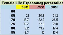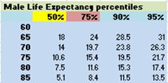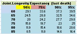 Another interesting point worth noting is that as individuals age, their life expectancy is decreasing, but by fewer years than have elapsed; e.g. general population life expectancy of a 65 year old couple is 24.5 years or age 89.5, but when they reach age 75 their life expectancy is 15.8 years or age 90.8, while at age 85 it is 8.5 years or age 93.5. This is because with increasing age additional people will have already died, and thus, from this new age looking ahead, the 50th percentile point shifts further out for those still alive. The message is that life expectancy is generally not a good number to use for retirement planning purposes at any age. Some conservative planners are using ages 95 or 100 as the planning ages of death for retirement finance, especially for couples. Notice that the 95th percentile ultraconservative life expectancy at all the ages indicates about 100!
