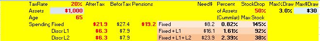 The Yellow Box portion of the spreadsheet allows you use your age, the value of your assets, fixed and discretionary expenses, average tax rate and your assumed “worst case” stock market drop to estimate you maximum stock allocation for the coming year without jeopardizing income coverage for your fixed, and discretionary expenses. Note that the age is used to (automatically) extract the maximum percent draw from the Female Maximum % (pink) column in the spreadsheet using the specified Current Real Return (0.6% here). The ‘age’ you specify (65 here) is used point to the corresponding withdrawal rate (3.0% here).