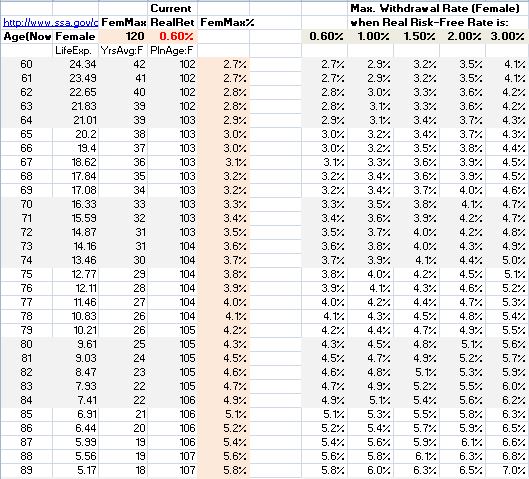 A little further on I’ll provide a table with the current maximum percent first year draw as a function of age for females, and a link to a spreadsheet to do the calculation if you need it when rates change. (Using females for simplicity and a compromise between somewhat lower life-expectancy males and joint life expectancy of a couple; at age 65 joint life expectancy is about 3.5 years longer than for females, decreasing to 2.2 years by age 85. Using the female table for all healthy individuals will give a good sense of what is maximum draw; you can refine the estimate further by increasing the age of males by 1-2 years and reducing the age joint age by 1-2 years especially at younger ages.)