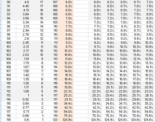 -years of payment= the average of current life expectancy and 120 (a very conservative maximum lifespan assumed by this paper)…so if current (say female) age is 70 then life expectancy  from the Social Security Actuarial Tables  is 16 years and maximum lifespan of another 50 years (from 70 to 120), then the average would be (16+50)/2=33 years of payments which is a clearly conservative estimate of a planning age 103 for a 70 year old female; this is also recalculated each year as one ages, so for example for a 90 year old female the planning age becomes 107; or simply look it up in Table 1 further in this blog post. The resulting spending curve gives a great deal of real income protection well into one’s 11th decade