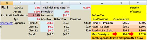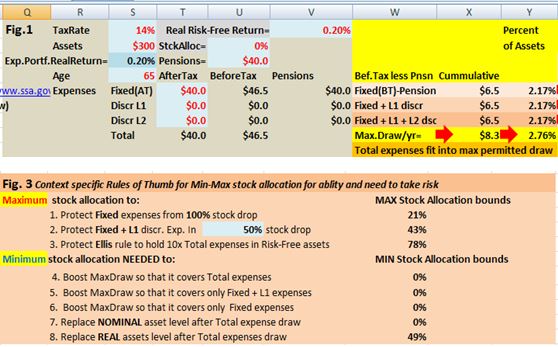 So the stock allocation bookends might, for example, be determined by a maximum which protects the asset coverage of Fixed and/or ‘Fixed + Level1’ discretionary expenses following a 100% and/or 50% respectively (or you pick other maximum market drops scenarios) or the typically less constraining Ellis rule-of-thumb which suggests keeping 10 years of income requirement in low risk fixed income assets and a minimum which will boost expected average return so that maximum permissible draw is raised to the level of total expenses, or provide some mitigation of the corrosive effects of inflation subject to willingness/ability to deal with an occasional reduction of the desired discretionary expenses. These bounds are listed in Fig. 3 portion of the spreadsheet; examining these 8 bounds listed, 3-maximums and 5- minimums, might together with our willingness to take risk, will help guide us to our appropriate stock allocation. For example