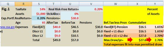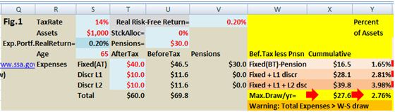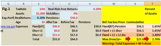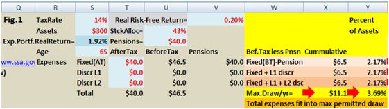 The Fig. 1 portion of the spreadsheet will be used later to gather most of the required inputs necessary to start discussing asset allocation. NOTE: If you are ready to try it now…In Microsoft Excel 2007 the link opens in Excel Online. Then click on ‘Edit Workbook’ on top and select from dropdown menu ‘Edit in Excel Online’ OR on the top far right side click on the 3-dots and from dropdown menu select “download a copy” . You are now ready to go! Also note, that you may click on any of the Illustrations below to enlarge them and make them more readable; when done with it, just click on “Back” button of your browser to continue reading the blog post. (A simpler version of this spreadsheet is now available here.) Remember that we’ll be building on the W-S approach to calculate maximum permissible withdrawals using a risk-free portfolio (i.e. excludes risky assets in general, and stocks in particular), as shown below: