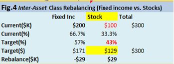 Once we have determined the fixed and stock allocations of our current portfolio, then using our target portfolio’s percent of stock allocation, we can then calculate the changes required to our current portfolio to align it with this new target. Fig. 4, where this is referred to as “inter-asset class” (i.e. between stocks and fixed income) rebalancing, shows how this calculation is done. You just need the required inputs, shown in red. (Note that total portfolio size is taken from the “Assets” specified in the top left-hand corner of the spreadsheet and one needs to only enter the dollars allocated to the fixed income portion of the portfolio, and the target stock allocation; everything else is calculated automatically.