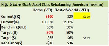 Fig. 5 shows a simple (two-ETF) implementation of the stock portion of the portfolio for an American investor. This is composed of two Vanguard (US based) ETFs: VTI (Total US stock market) and VEU (Vanguards All-world stock market ex-US, i.e. the Rest-of-the-World which include developed and emerging markets). The only inputs required here are the dollars currently allocated to home (US) based stocks and the target percent of US stocks out of the total tock allocation (50% was chosen here)