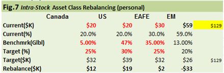 Fig.7 shows my personal stock sub-allocation with Canada, US, EAFE (developed markets ex-North America) and Emerging Markets with target allocations of 25%, 30%, 25% and 20% (which is overweighed, for better or worse, in EM stocks due to valuation and GDP growth considerations.)