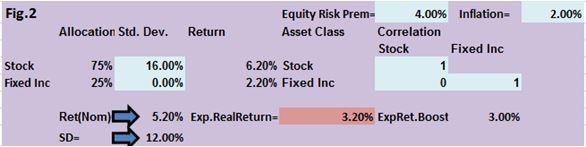 In Fig. 2 we assume ‘Real risk-free return’=0.2%, ‘Inflation’=2% and an Equity Risk Premium = 4%; ’stock ‘volatility’ or ‘standard deviation’ (SD)=16%. Therefore ‘nominal risk-free return’= 2.2% (0.2%+2.0%) while nominal stock return= 6.2% (2.2%+4%).