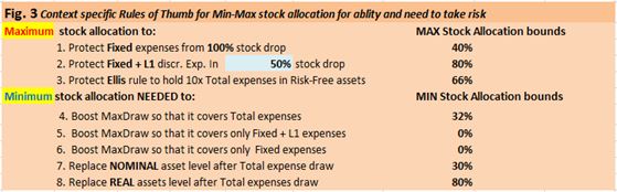 Maximum stock allocation To bookend maximum stock allocation we could use: (1) maximum tolerable loss at 50% (which is changeable to some other level e.g. 40% or 75%) of stock drop which will still leave sufficient assets to deliver the required income for Fixed plus L! discretionary expenses, or (2) maximum tolerable loss at 100% stock drop while protecting Fixed expense coverage, or (3) Charles Ellis’s recommendation of protecting 10 years of (e.g. Fixed or Fixed+L1 discretionary or Total) expenses with safe fixed income assets and using the remaining assets available for stock allocation. (See Fig. 3 for the three values of these maximums for a specific retirement circumstance.)
