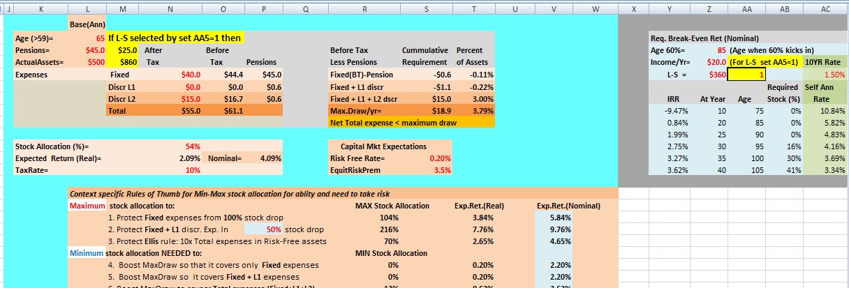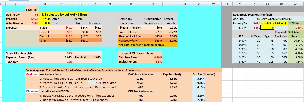 Therefore at Lump Sum= $360K to protect Fixed Expenses from a 100% and 50% stock drop (in this case where L1=$0K) the maximum stock allocation permissible would respectively be 18% and 36%; the 36% maximum permitted stock allocation, acceptable in case of a 50% stock drop, exceeds the required 30% stock allocation achieve the break-even 3.24% return at the 75th percentile joint age of 95, so it might be workable. When the Lump Sum is reduced (keeping the annuity still at $20K) to $320K (-11%) and $280K (-22%) the maximum permissible stock allocations for a 50% drop in stock value, becomes 28% and 19%, which are well below the required returns/stock allocations for the break-even return at age 95. Note that at Lump Sum= $320K, the Ellis rule derived maximum stock allocation is 56%, which is in the same ballpark as the 59% stock allocation required for the break-even return at the 75th-percentile age of 95 if survivor benefit of 60% kicks in at age 90.
